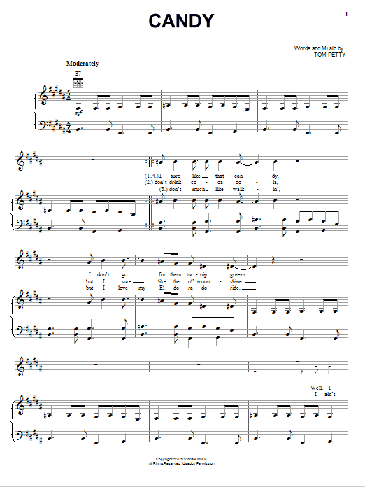 Download or print Tom Petty And The Heartbreakers Candy sheet music, chords and digital score arranged for Piano, Vocal & Guitar Chords (Right-Hand Melody). This Pop score includes 4 page(s).