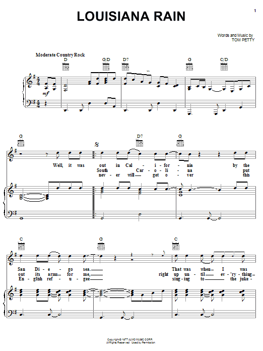 Download or print Tom Petty And The Heartbreakers Louisiana Rain sheet music, chords and digital score arranged for Piano, Vocal & Guitar Chords (Right-Hand Melody). This Pop score includes 6 page(s).