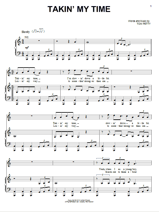 Download or print Tom Petty And The Heartbreakers Takin' My Time sheet music, chords and digital score arranged for Piano, Vocal & Guitar Chords (Right-Hand Melody). This Pop score includes 3 page(s).