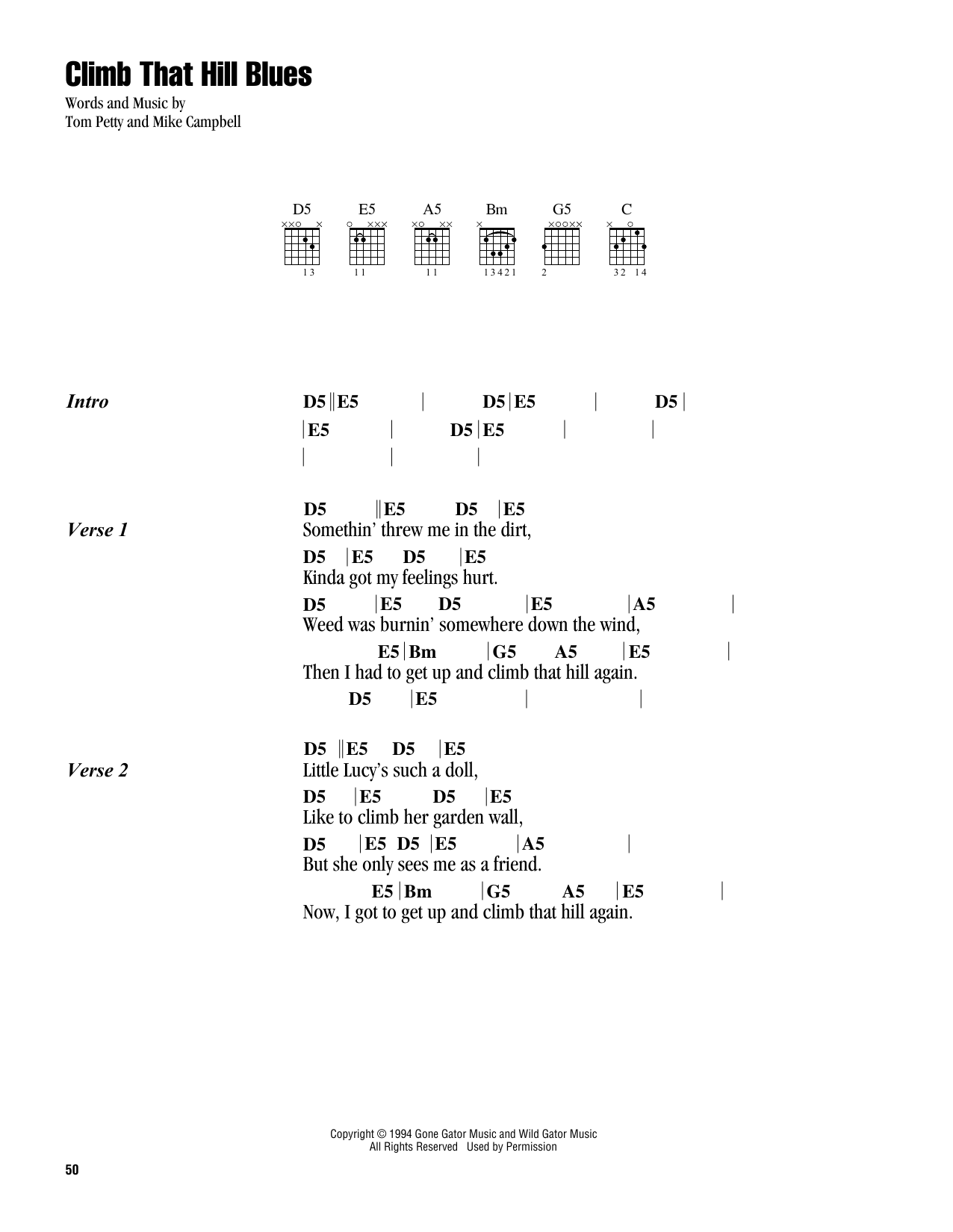 Download or print Tom Petty Climb That Hill Blues sheet music, chords and digital score arranged for Guitar Chords/Lyrics. This Rock score includes 2 page(s).