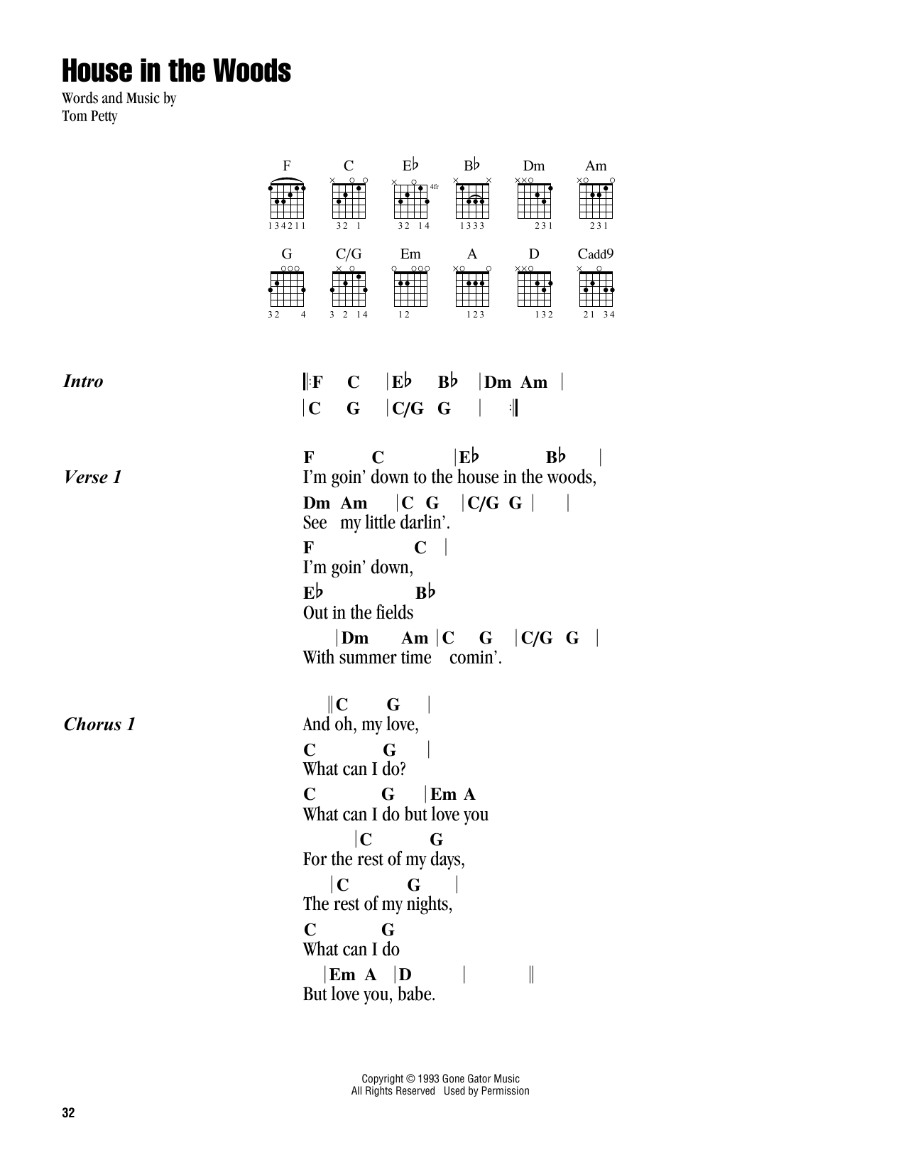Download or print Tom Petty House In The Woods sheet music, chords and digital score arranged for Guitar Chords/Lyrics. This Rock score includes 2 page(s).