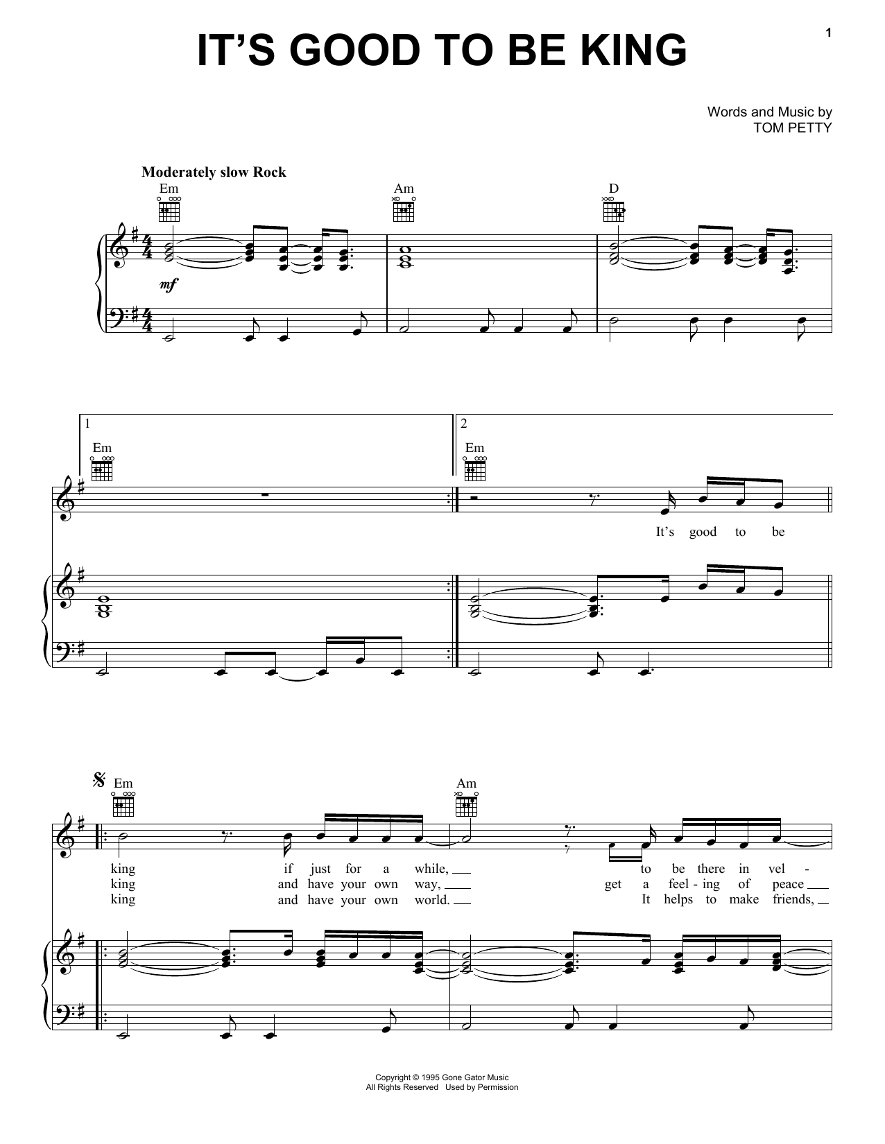 Download or print Tom Petty It's Good To Be King sheet music, chords and digital score arranged for Piano, Vocal & Guitar Chords (Right-Hand Melody). This Pop score includes 4 page(s).