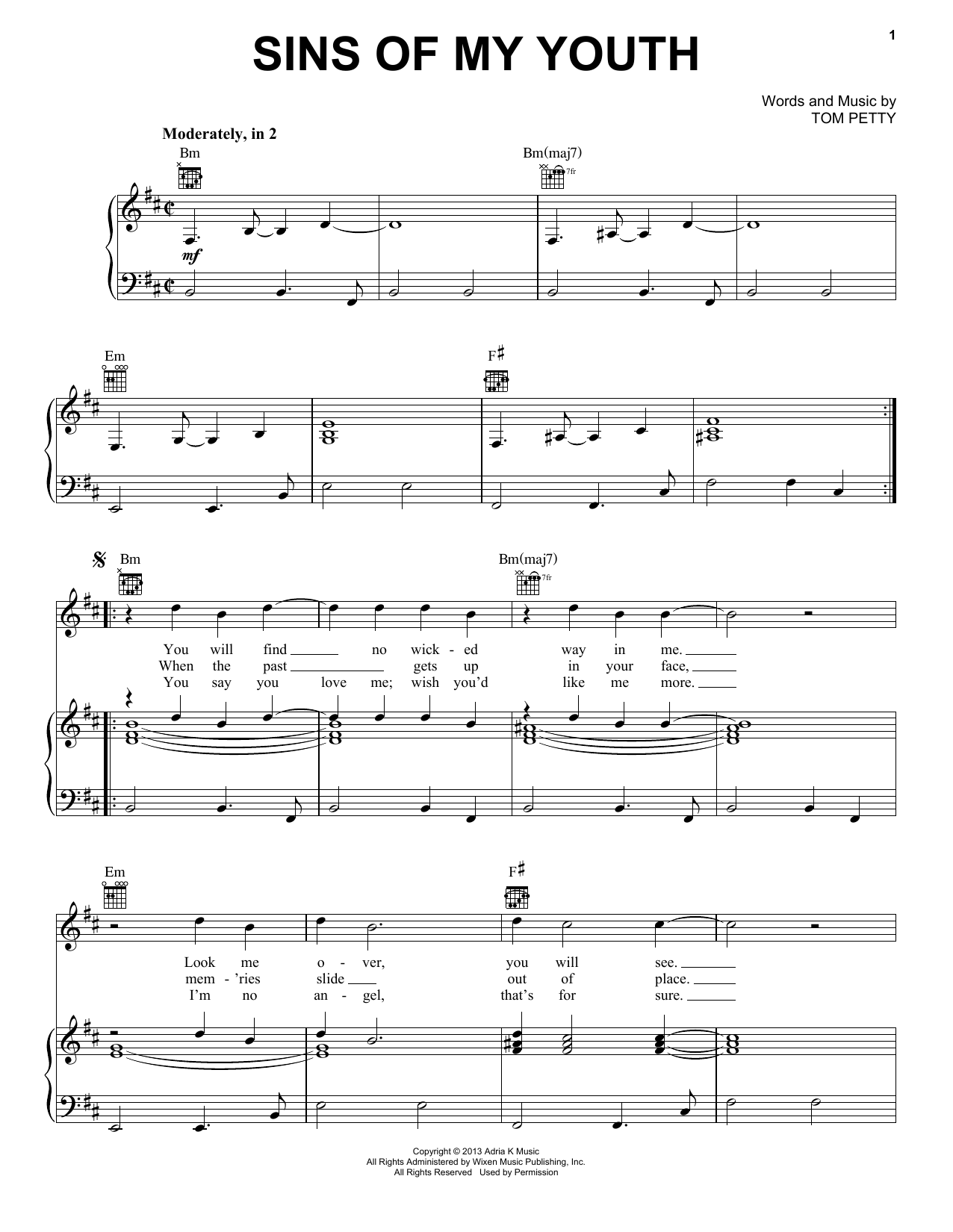 Download or print Tom Petty & the Heartbreakers Sins Of My Youth sheet music, chords and digital score arranged for Piano, Vocal & Guitar Chords (Right-Hand Melody). This Pop score includes 5 page(s).