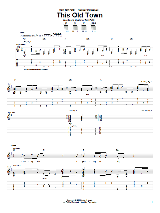 Download or print Tom Petty This Old Town sheet music, chords and digital score arranged for Guitar Tab. This Pop score includes 6 page(s).