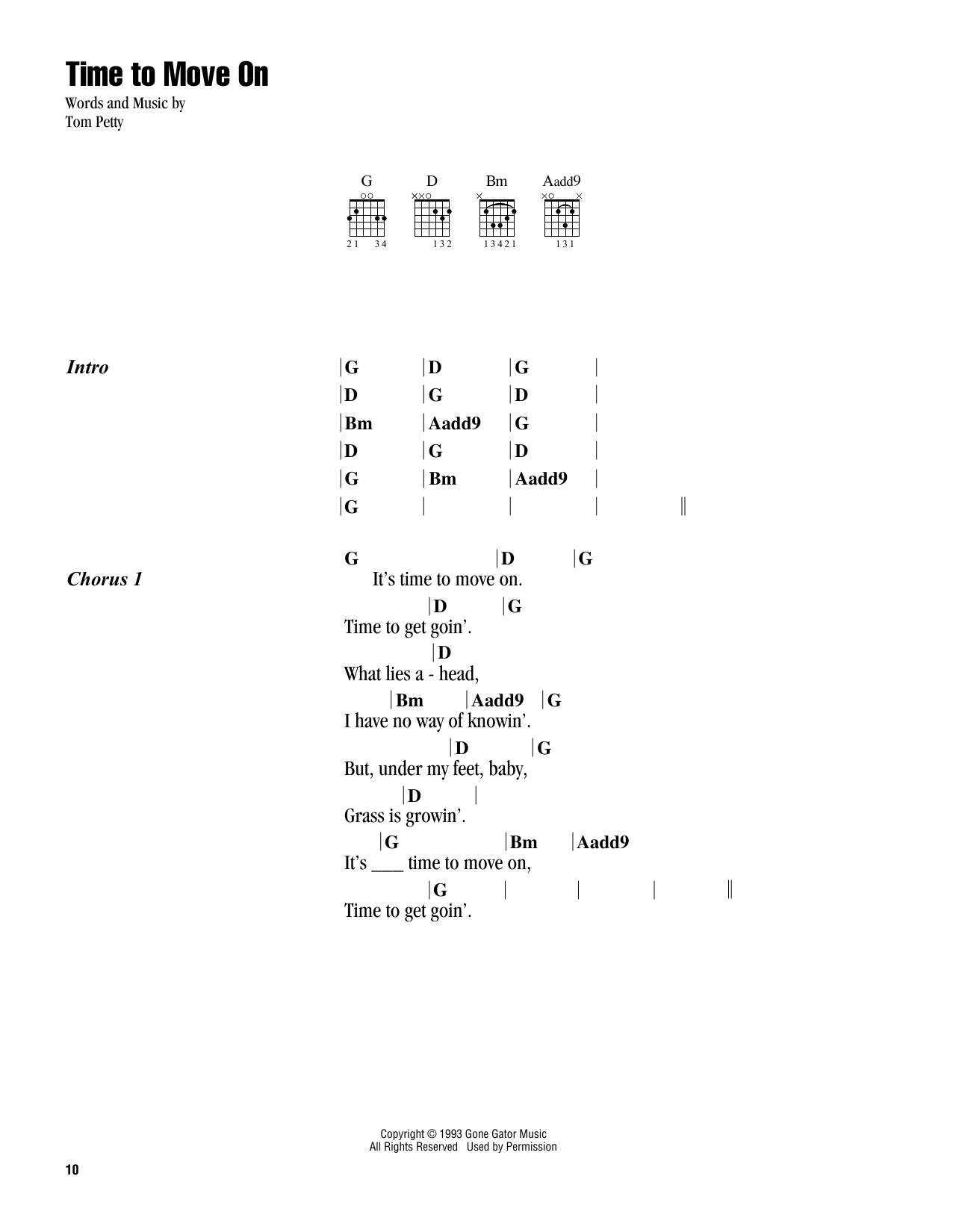 Download or print Tom Petty Time To Move On sheet music, chords and digital score arranged for Guitar Chords/Lyrics. This Rock score includes 4 page(s).