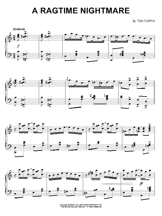 Download or print Tom Turpin A Ragtime Nightmare sheet music, chords and digital score arranged for Piano Solo. This Jazz score includes 4 page(s).