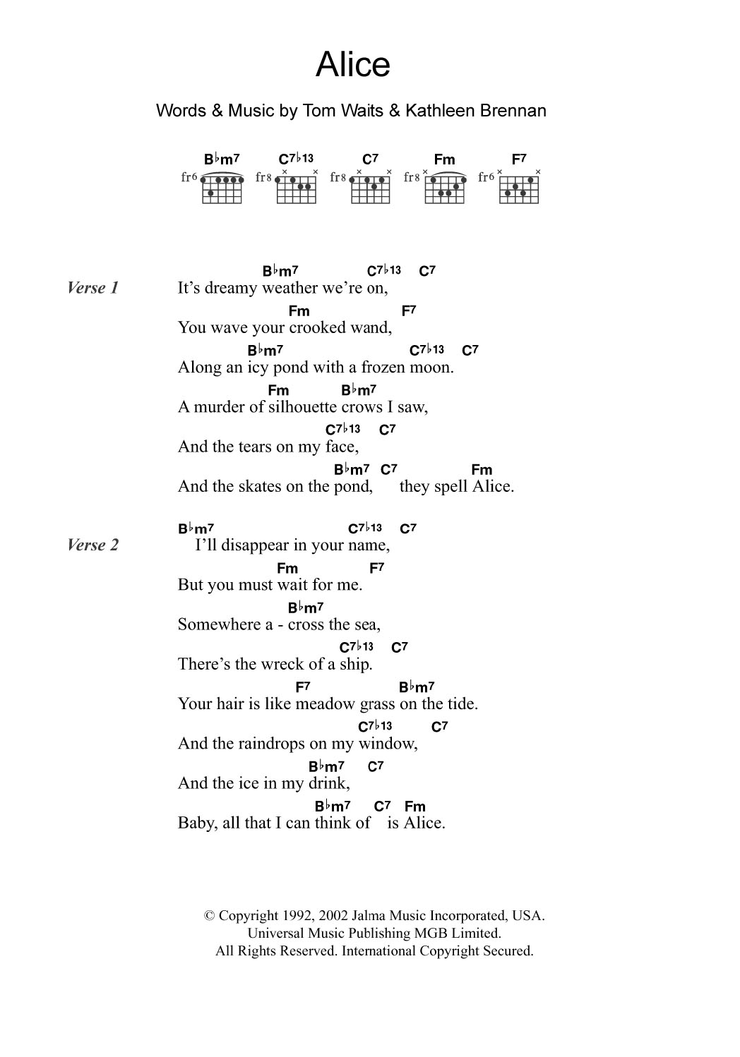 Download or print Tom Waits Alice sheet music, chords and digital score arranged for Guitar Chords/Lyrics. This Rock score includes 3 page(s).