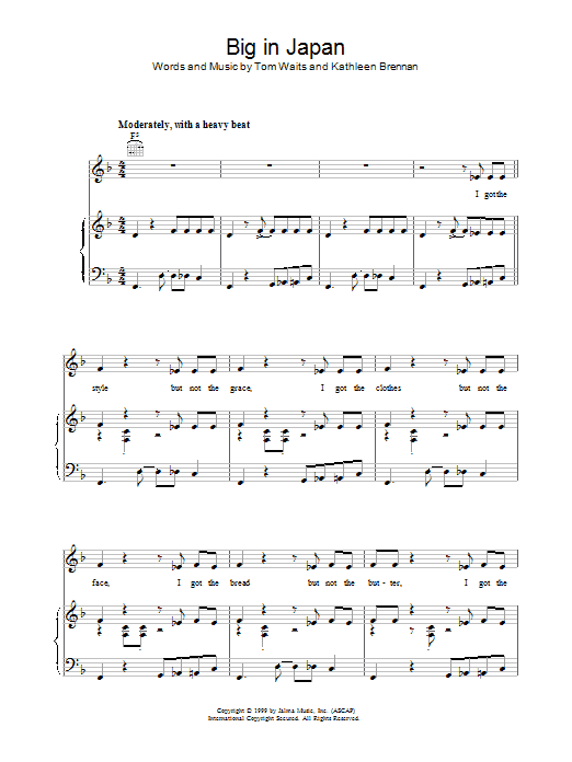 Download or print Tom Waits Big In Japan sheet music, chords and digital score arranged for Guitar Chords/Lyrics. This Rock score includes 3 page(s).