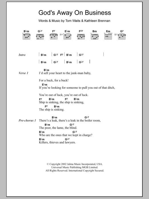 Download or print Tom Waits God's Away On Business sheet music, chords and digital score arranged for Guitar Chords/Lyrics. This Rock score includes 3 page(s).