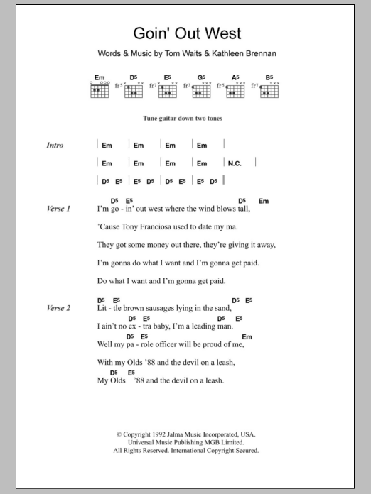Download or print Tom Waits Goin' Out West sheet music, chords and digital score arranged for Guitar Chords/Lyrics. This Rock score includes 2 page(s).