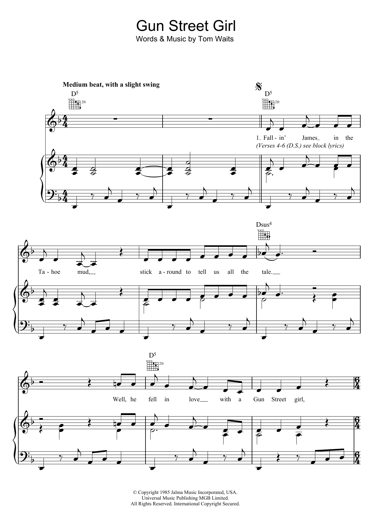Download or print Tom Waits Gun Street Girl sheet music, chords and digital score arranged for Guitar Chords/Lyrics. This Rock score includes 3 page(s).