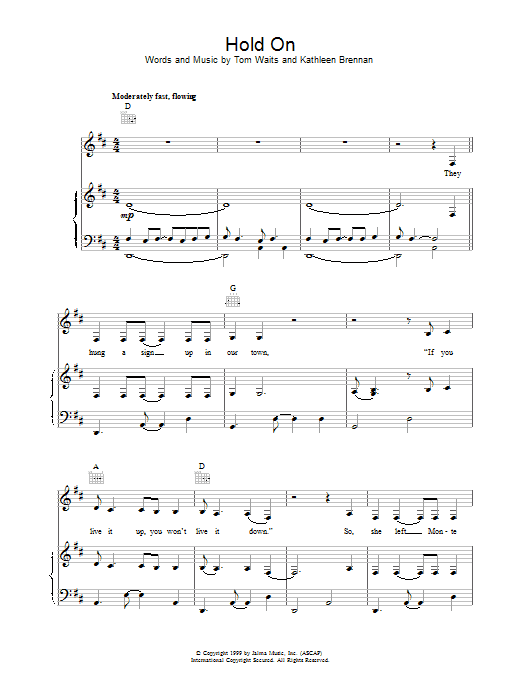 Download or print Tom Waits Hold On sheet music, chords and digital score arranged for Guitar Chords/Lyrics. This Rock score includes 4 page(s).