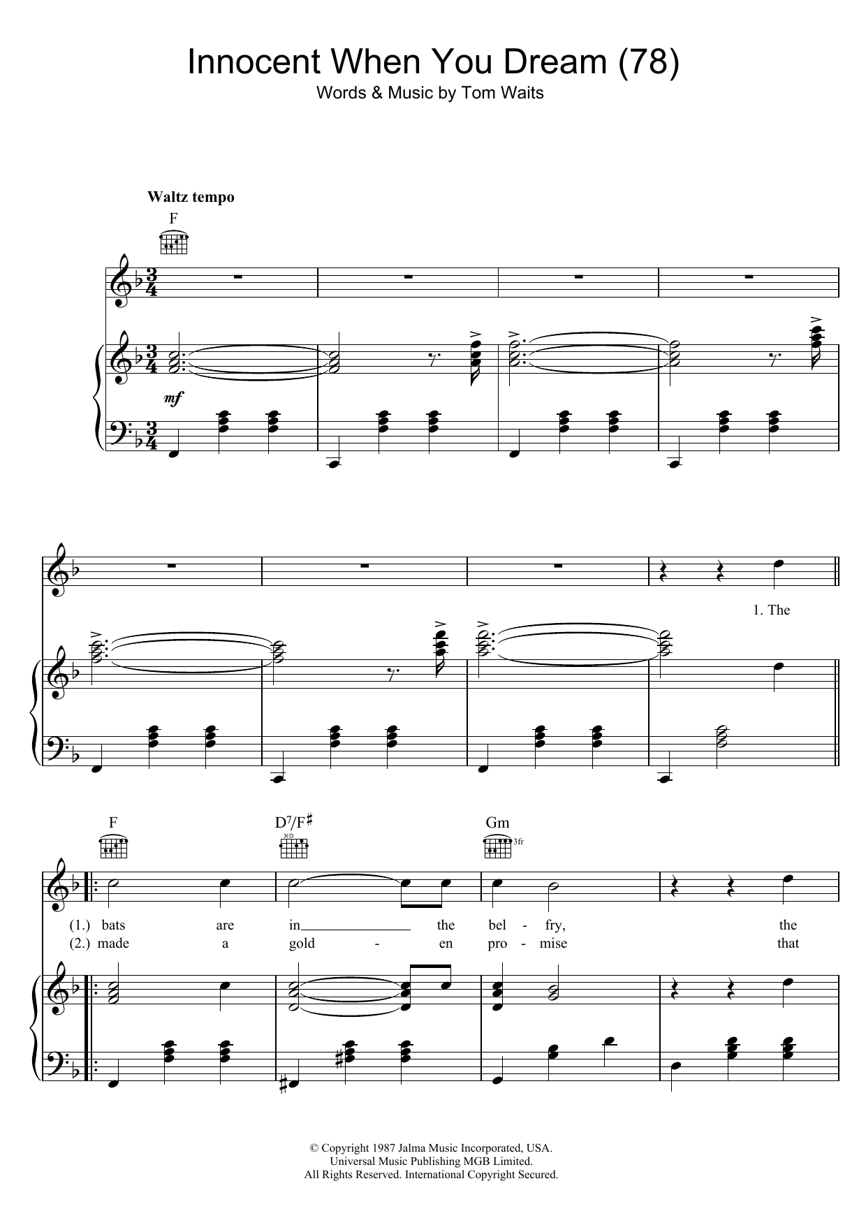 Download or print Tom Waits Innocent When You Dream (78) sheet music, chords and digital score arranged for Guitar Chords/Lyrics. This Rock score includes 3 page(s).