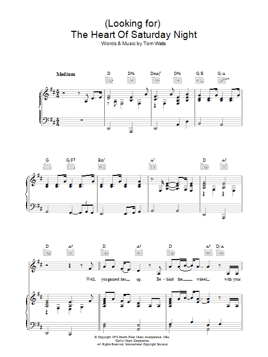 Download or print Tom Waits (Looking For) The Heart Of Saturday Night sheet music, chords and digital score arranged for Guitar Chords/Lyrics. This Rock score includes 3 page(s).