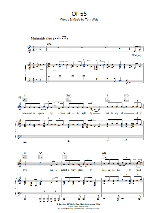 Download or print Tom Waits Ol' 55 sheet music, chords and digital score arranged for Piano, Vocal & Guitar Chords (Right-Hand Melody). This Folk score includes 5 page(s).