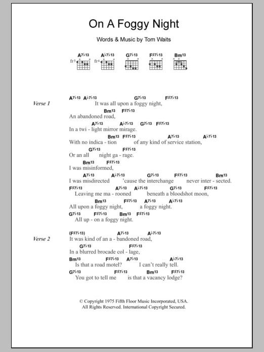 Download or print Tom Waits On A Foggy Night sheet music, chords and digital score arranged for Guitar Chords/Lyrics. This Rock score includes 2 page(s).
