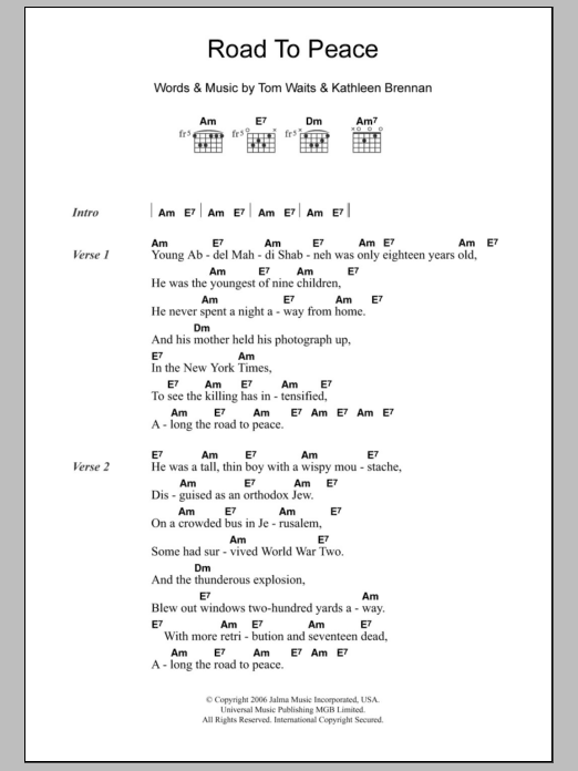 Download or print Tom Waits Road To Peace sheet music, chords and digital score arranged for Guitar Chords/Lyrics. This Rock score includes 5 page(s).