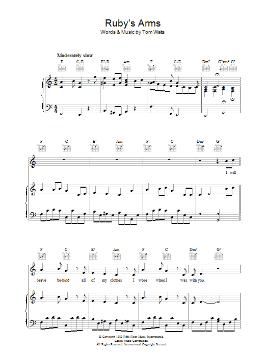 Download or print Tom Waits Ruby's Arms sheet music, chords and digital score arranged for Guitar Chords/Lyrics. This Rock score includes 2 page(s).