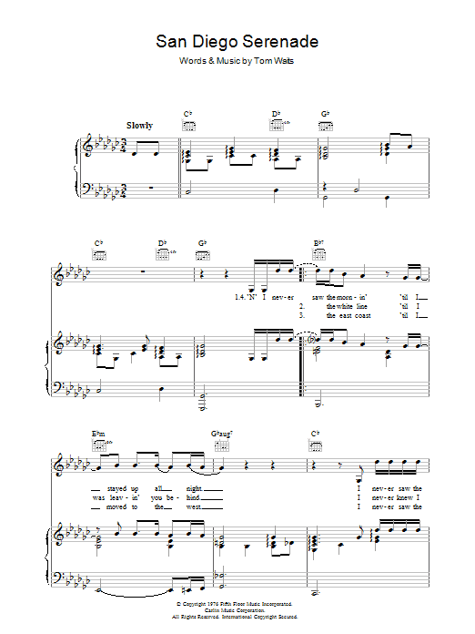 Download or print Tom Waits San Diego Serenade sheet music, chords and digital score arranged for Guitar Chords/Lyrics. This Rock score includes 2 page(s).