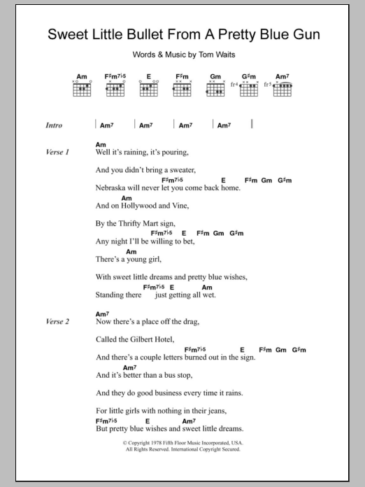 Download or print Tom Waits Sweet Little Bullet From A Pretty Blue Gun sheet music, chords and digital score arranged for Guitar Chords/Lyrics. This Rock score includes 3 page(s).