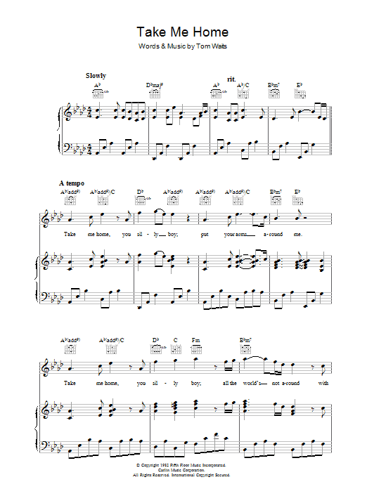Download or print Tom Waits Take Me Home sheet music, chords and digital score arranged for Piano, Vocal & Guitar Chords. This Rock score includes 2 page(s).