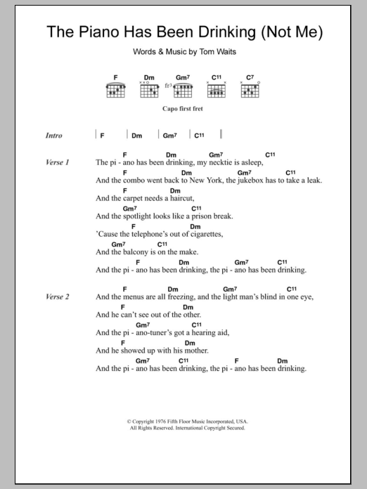Download or print Tom Waits The Piano Has Been Drinking (Not Me) sheet music, chords and digital score arranged for Guitar Chords/Lyrics. This Rock score includes 2 page(s).