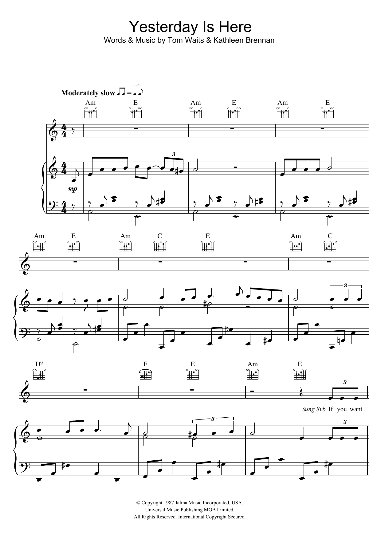 Download or print Tom Waits Yesterday Is Here sheet music, chords and digital score arranged for Guitar Chords/Lyrics. This Rock score includes 2 page(s).