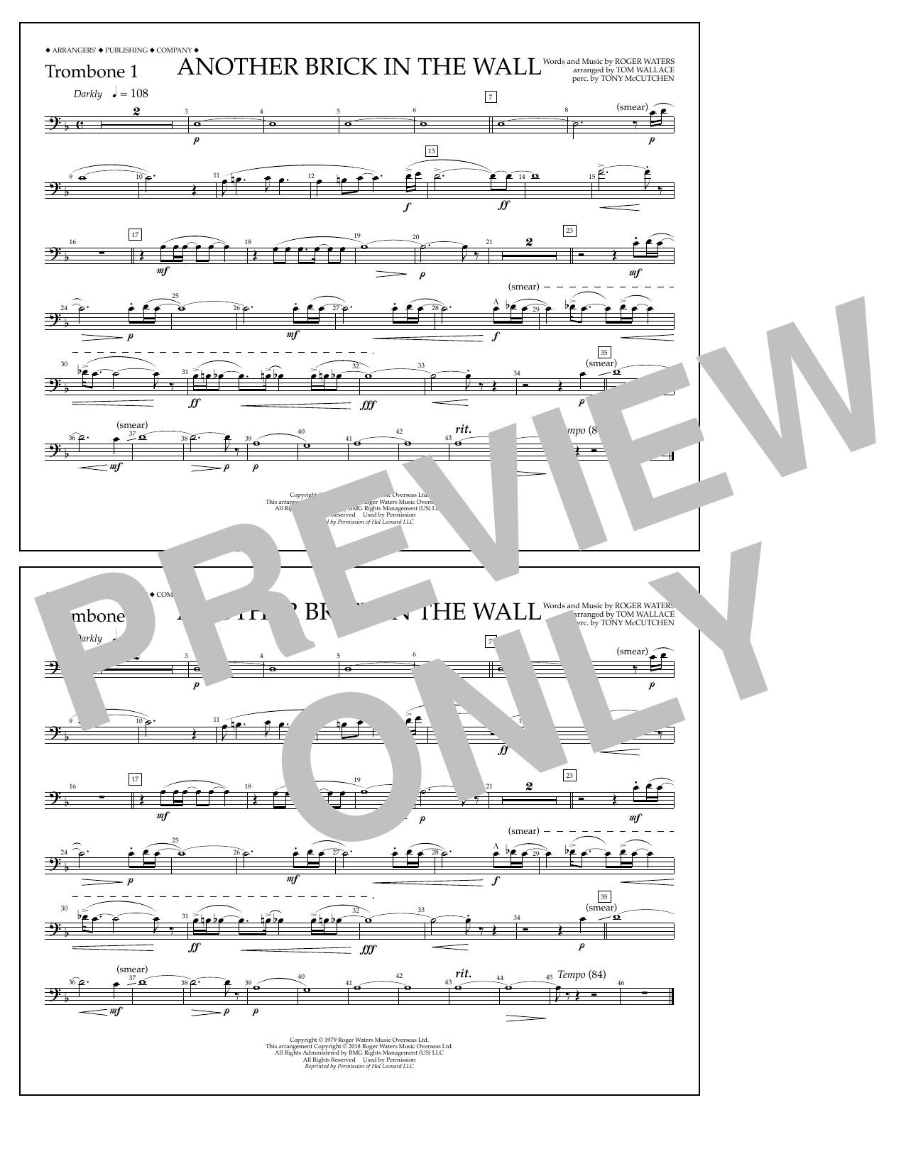 Download or print Tom Wallace Another Brick in the Wall - Trombone 1 sheet music, chords and digital score arranged for Marching Band. This Pop score includes 1 page(s).
