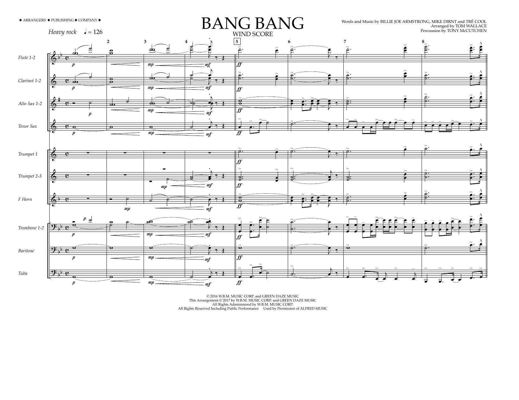 Download or print Tom Wallace Bang Bang - Wind Score sheet music, chords and digital score arranged for Marching Band. This Pop score includes 7 page(s).