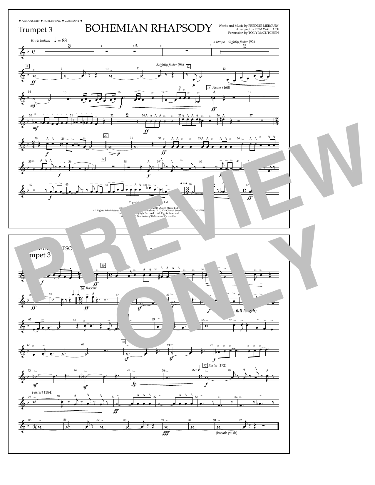 Download or print Tom Wallace Bohemian Rhapsody - Trumpet 3 sheet music, chords and digital score arranged for Marching Band. This Pop score includes 1 page(s).