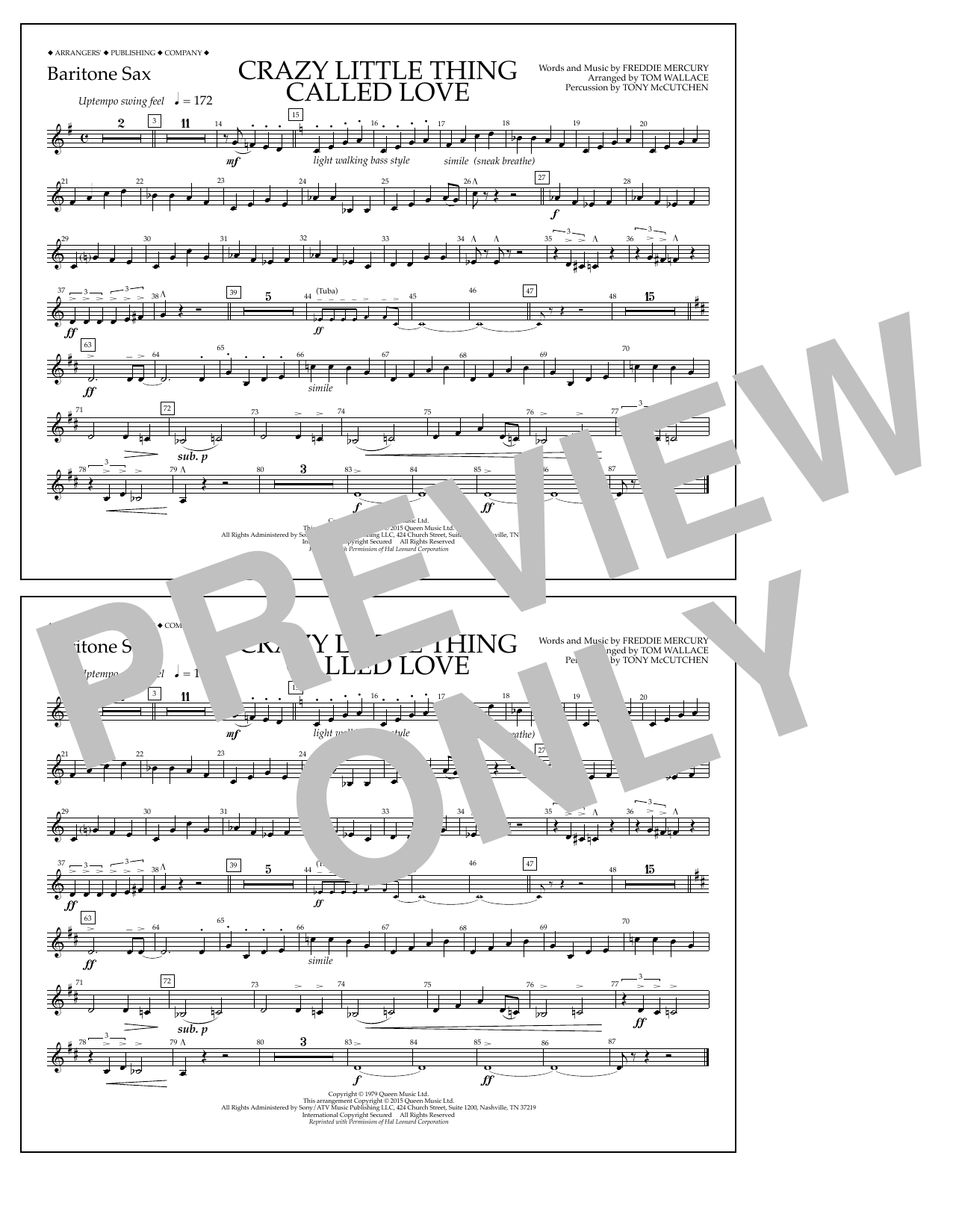 Download or print Tom Wallace Crazy Little Thing Called Love - Baritone Sax sheet music, chords and digital score arranged for Marching Band. This Pop score includes 1 page(s).