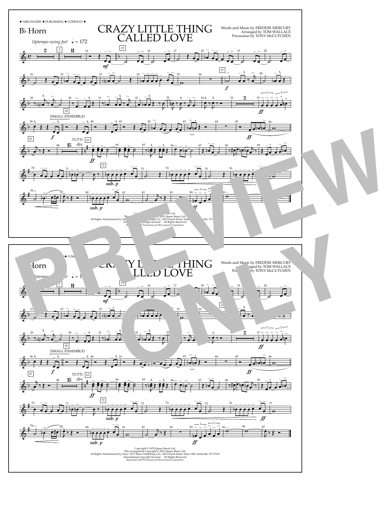 Download or print Tom Wallace Crazy Little Thing Called Love - Bb Horn sheet music, chords and digital score arranged for Marching Band. This Pop score includes 1 page(s).