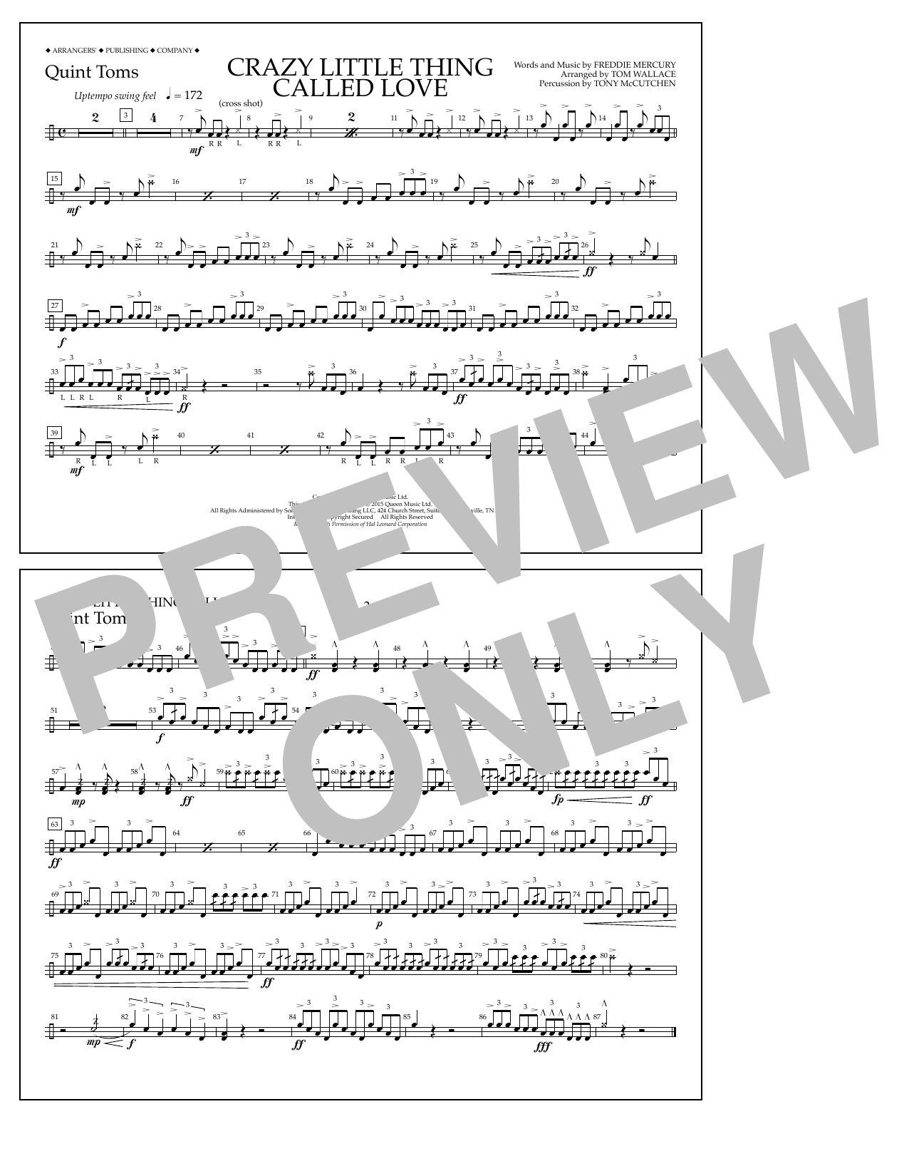 Download or print Tom Wallace Crazy Little Thing Called Love - Quint-Toms sheet music, chords and digital score arranged for Marching Band. This Pop score includes 1 page(s).