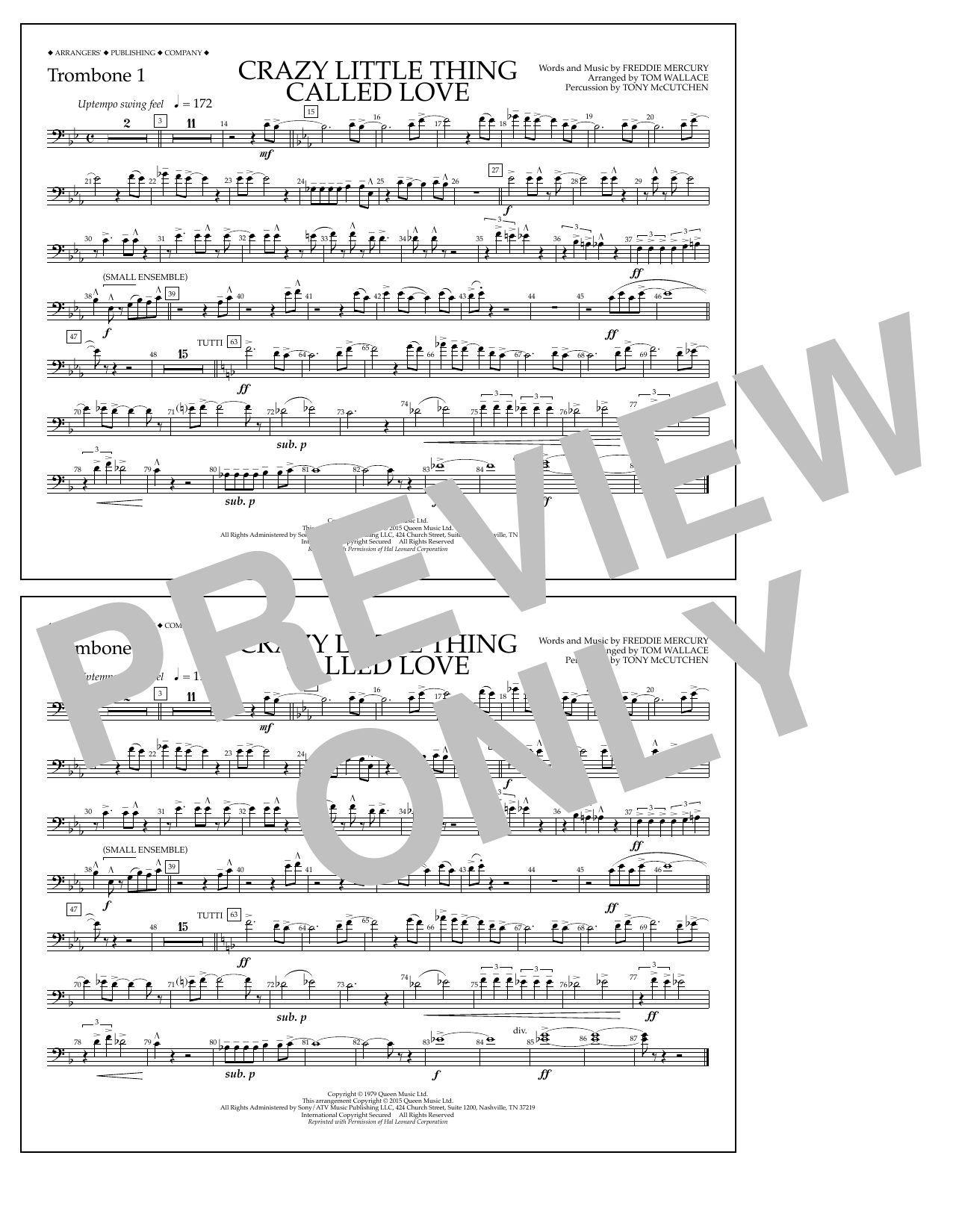 Download or print Tom Wallace Crazy Little Thing Called Love - Trombone 1 sheet music, chords and digital score arranged for Marching Band. This Pop score includes 1 page(s).