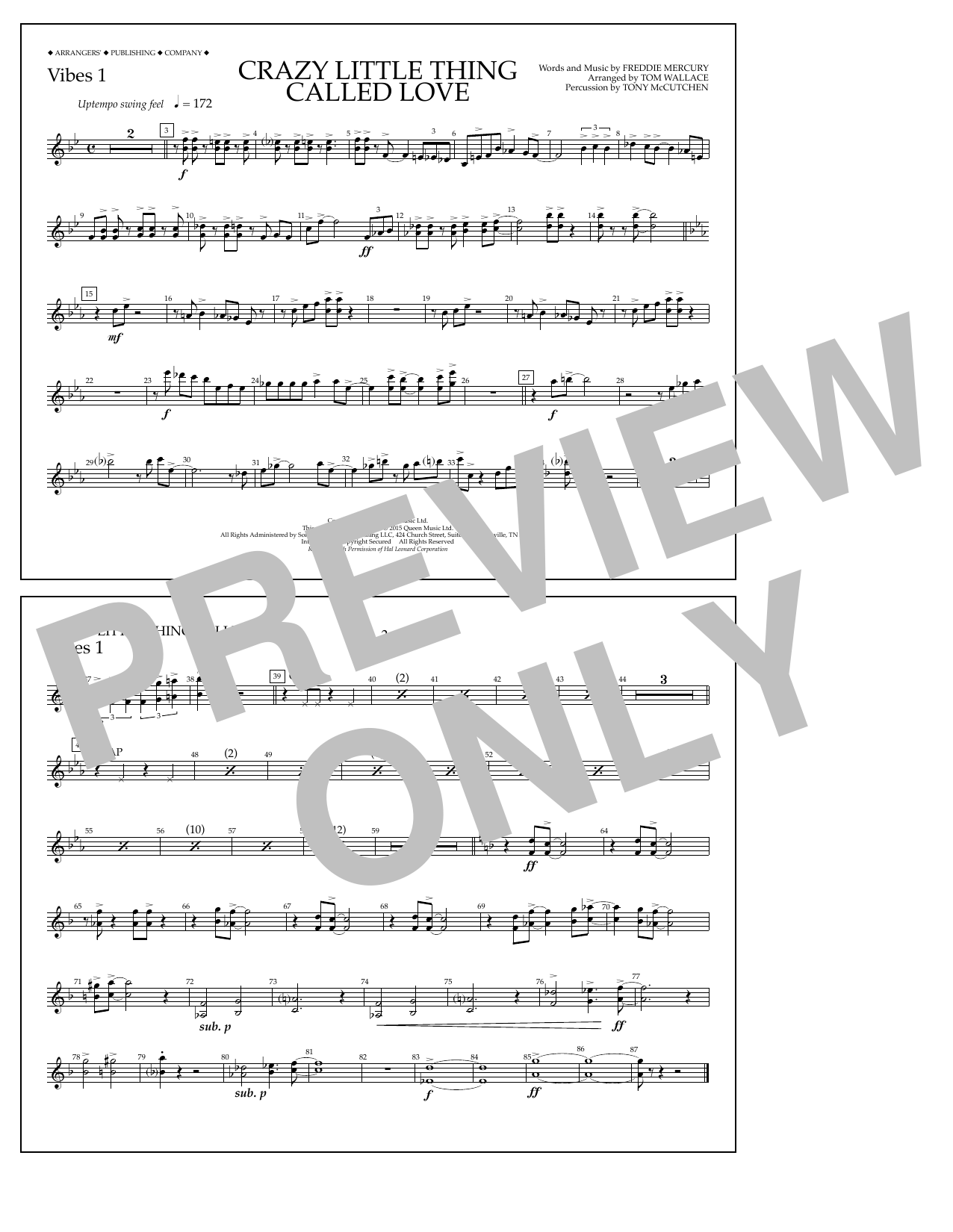 Download or print Tom Wallace Crazy Little Thing Called Love - Vibes 1 sheet music, chords and digital score arranged for Marching Band. This Pop score includes 1 page(s).