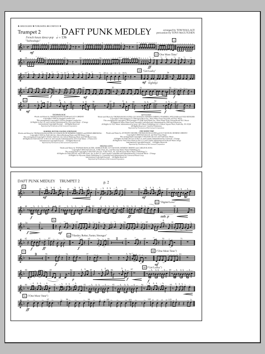 Download or print Tom Wallace Daft Punk Medley - Trumpet 2 sheet music, chords and digital score arranged for Marching Band. This Pop score includes 1 page(s).