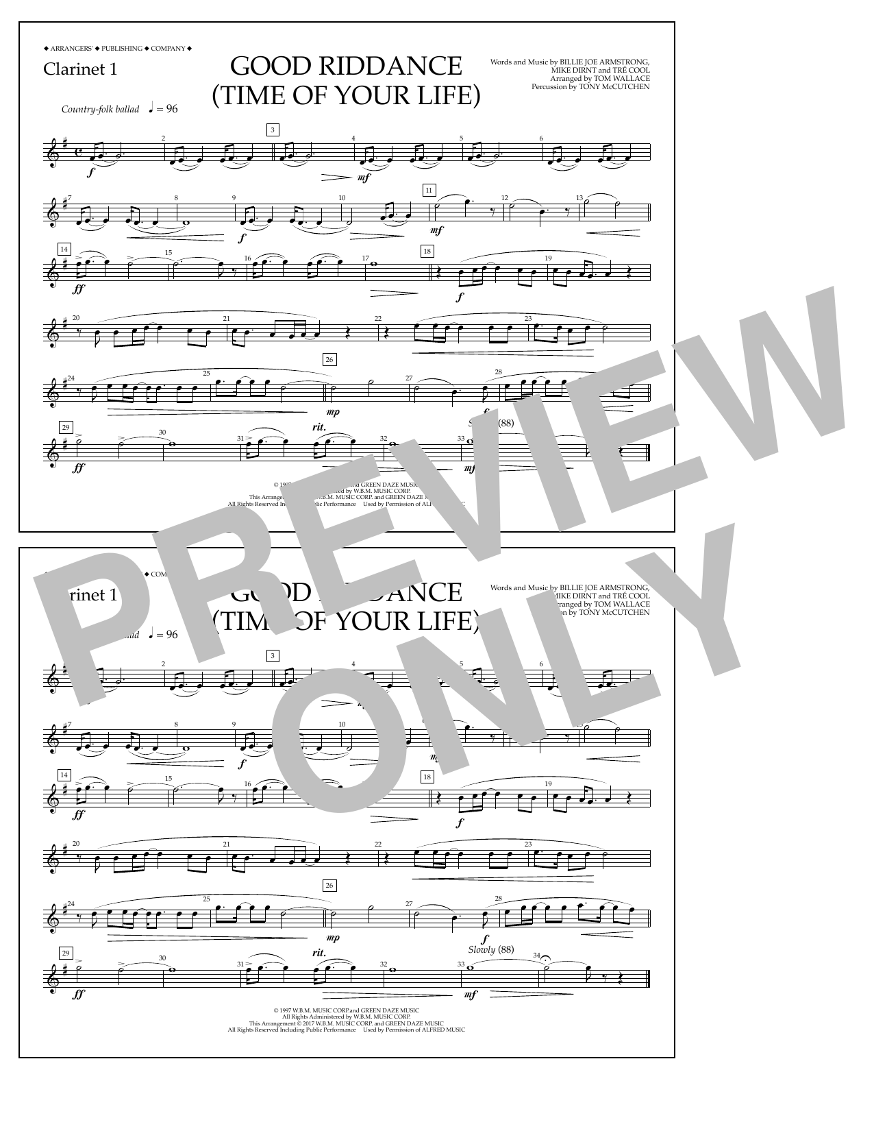 Download or print Tom Wallace Good Riddance (Time of Your Life) - Clarinet 1 sheet music, chords and digital score arranged for Marching Band. This Pop score includes 1 page(s).