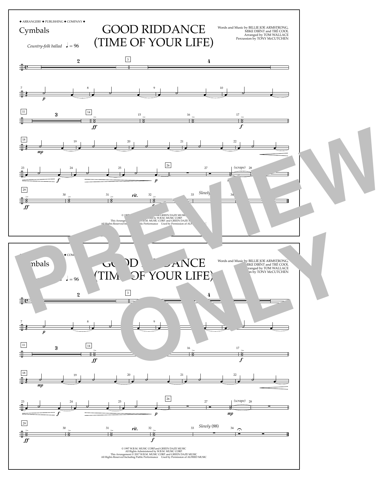 Download or print Tom Wallace Good Riddance (Time of Your Life) - Cymbals sheet music, chords and digital score arranged for Marching Band. This Pop score includes 1 page(s).