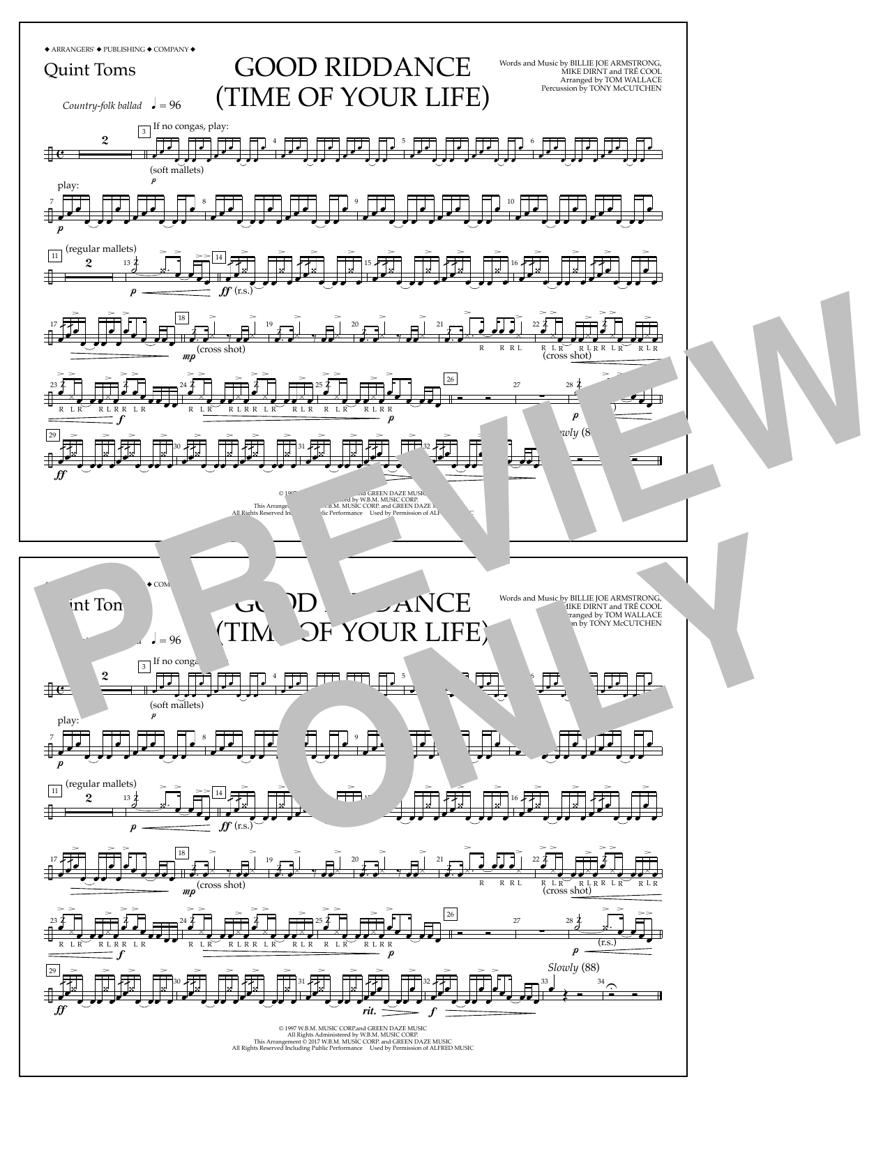 Download or print Tom Wallace Good Riddance (Time of Your Life) - Quint-Toms sheet music, chords and digital score arranged for Marching Band. This Pop score includes 1 page(s).