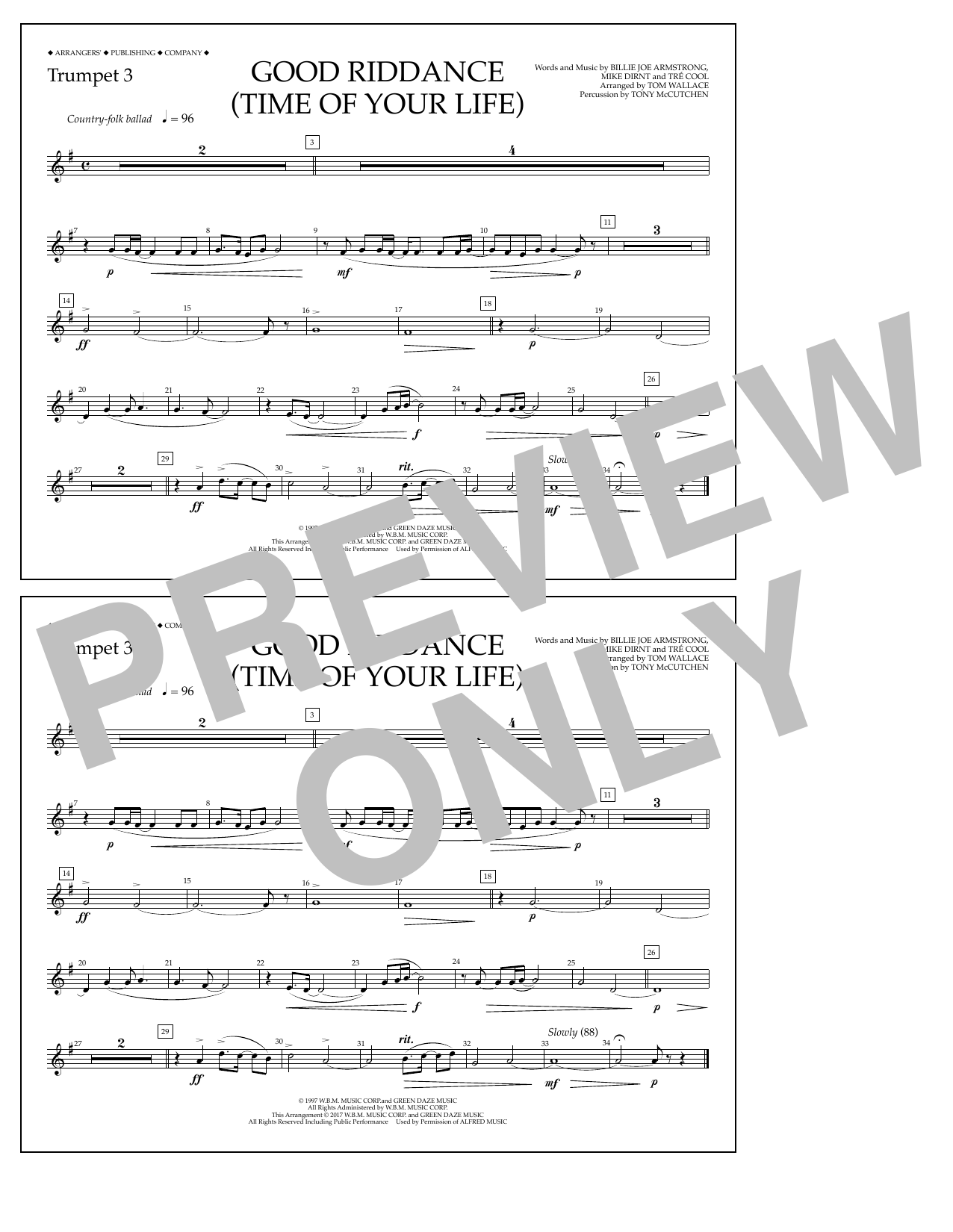 Download or print Tom Wallace Good Riddance (Time of Your Life) - Trumpet 3 sheet music, chords and digital score arranged for Marching Band. This Pop score includes 1 page(s).