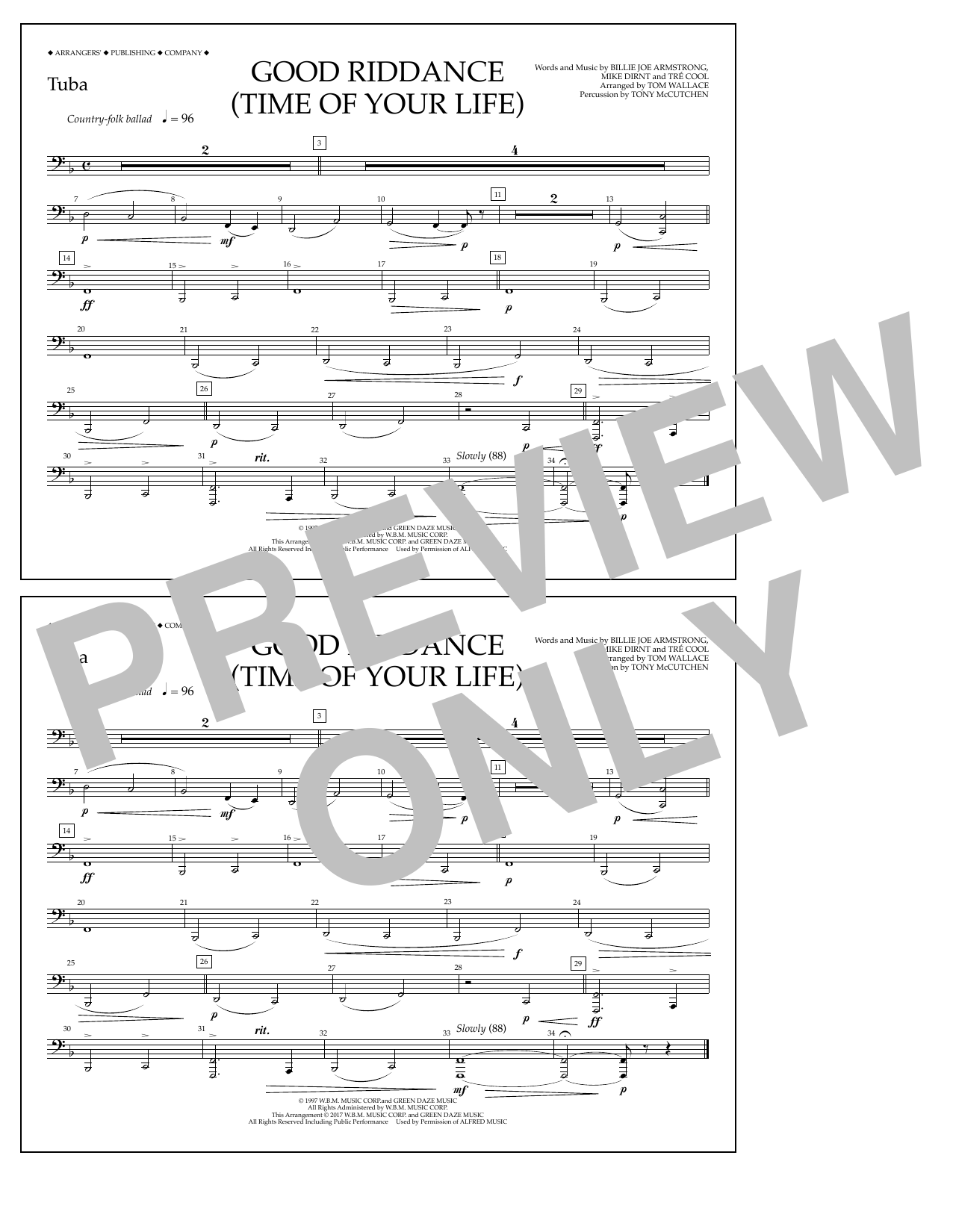 Download or print Tom Wallace Good Riddance (Time of Your Life) - Tuba sheet music, chords and digital score arranged for Marching Band. This Pop score includes 1 page(s).