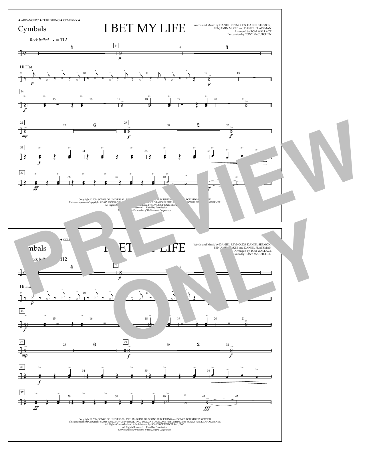 Download or print Tom Wallace I Bet My Life - Cymbals sheet music, chords and digital score arranged for Marching Band. This Rock score includes 1 page(s).