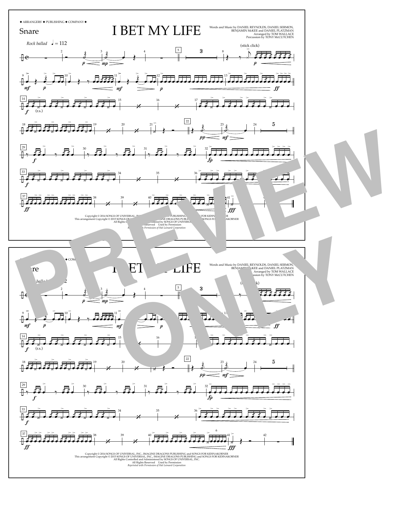 Download or print Tom Wallace I Bet My Life - Snare sheet music, chords and digital score arranged for Marching Band. This Rock score includes 1 page(s).