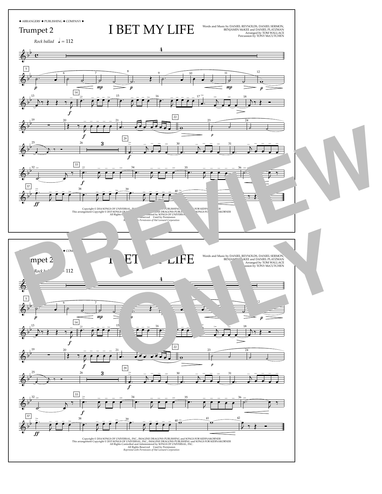Download or print Tom Wallace I Bet My Life - Trumpet 2 sheet music, chords and digital score arranged for Marching Band. This Rock score includes 1 page(s).