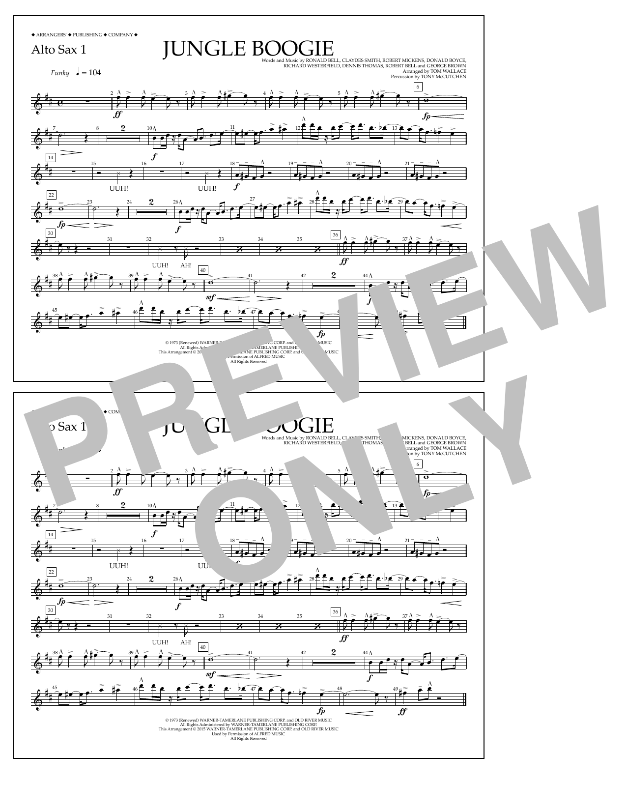 Download or print Tom Wallace Jungle Boogie - Alto Sax 1 sheet music, chords and digital score arranged for Marching Band. This Pop score includes 1 page(s).