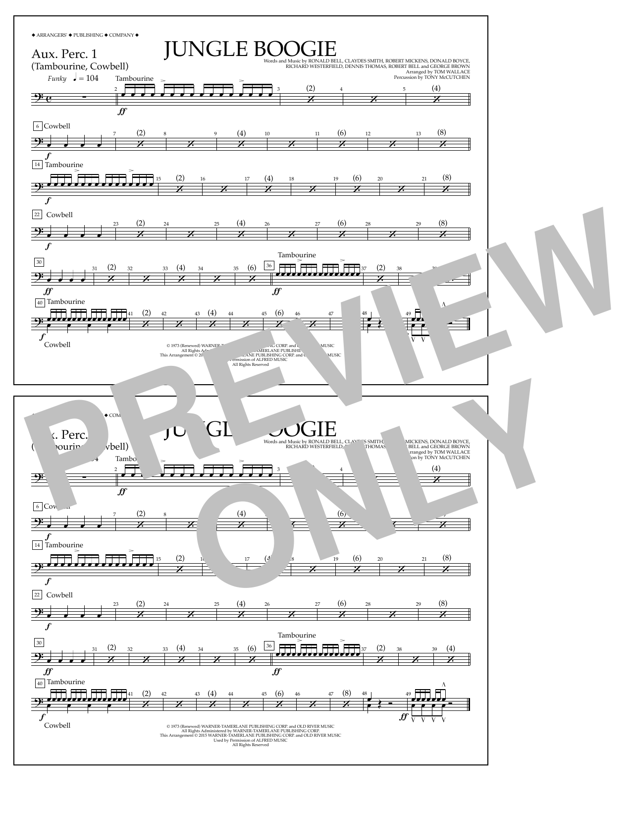 Download or print Tom Wallace Jungle Boogie - Aux. Perc. 1 sheet music, chords and digital score arranged for Marching Band. This Pop score includes 1 page(s).