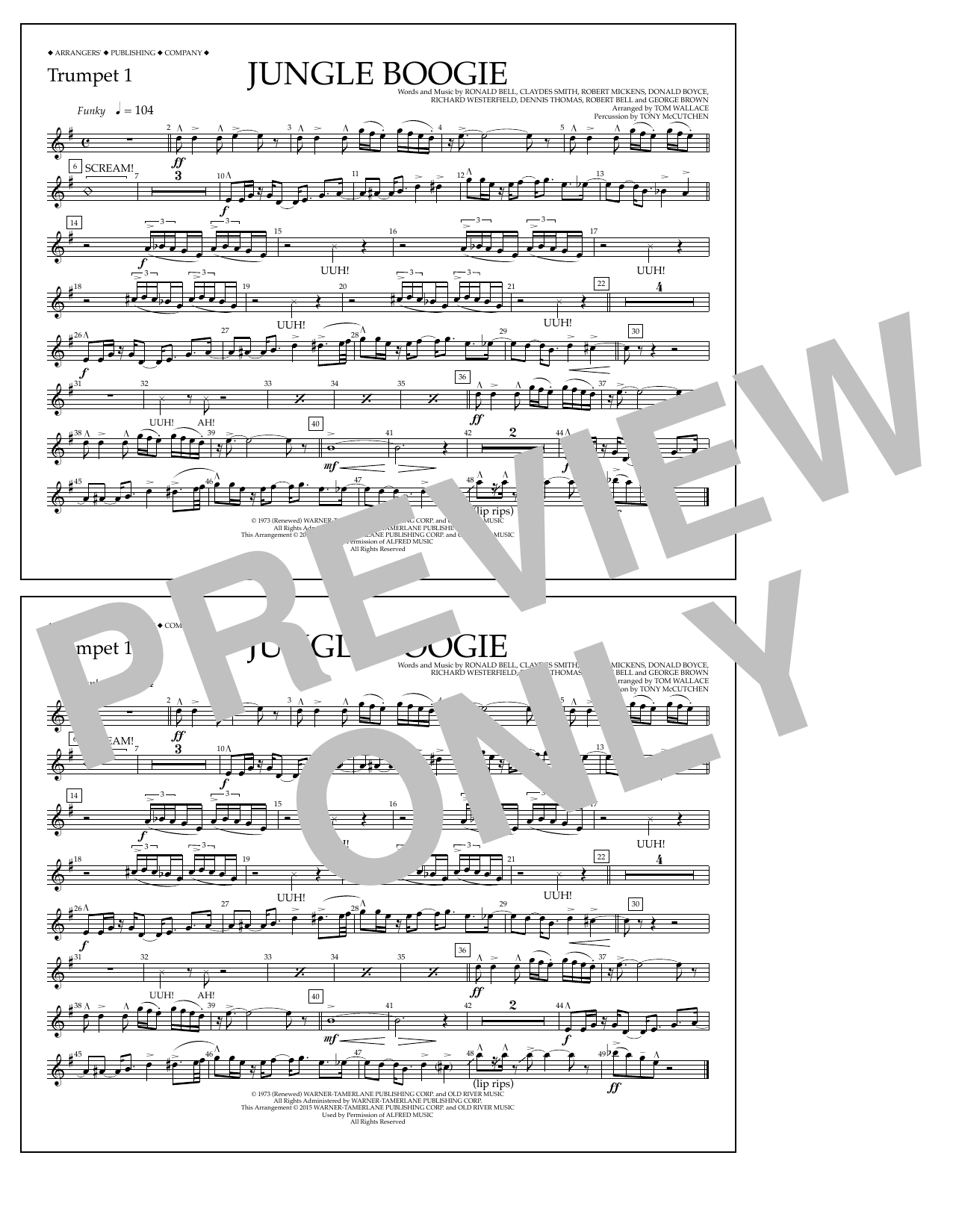 Download or print Tom Wallace Jungle Boogie - Trumpet 1 sheet music, chords and digital score arranged for Marching Band. This Pop score includes 1 page(s).