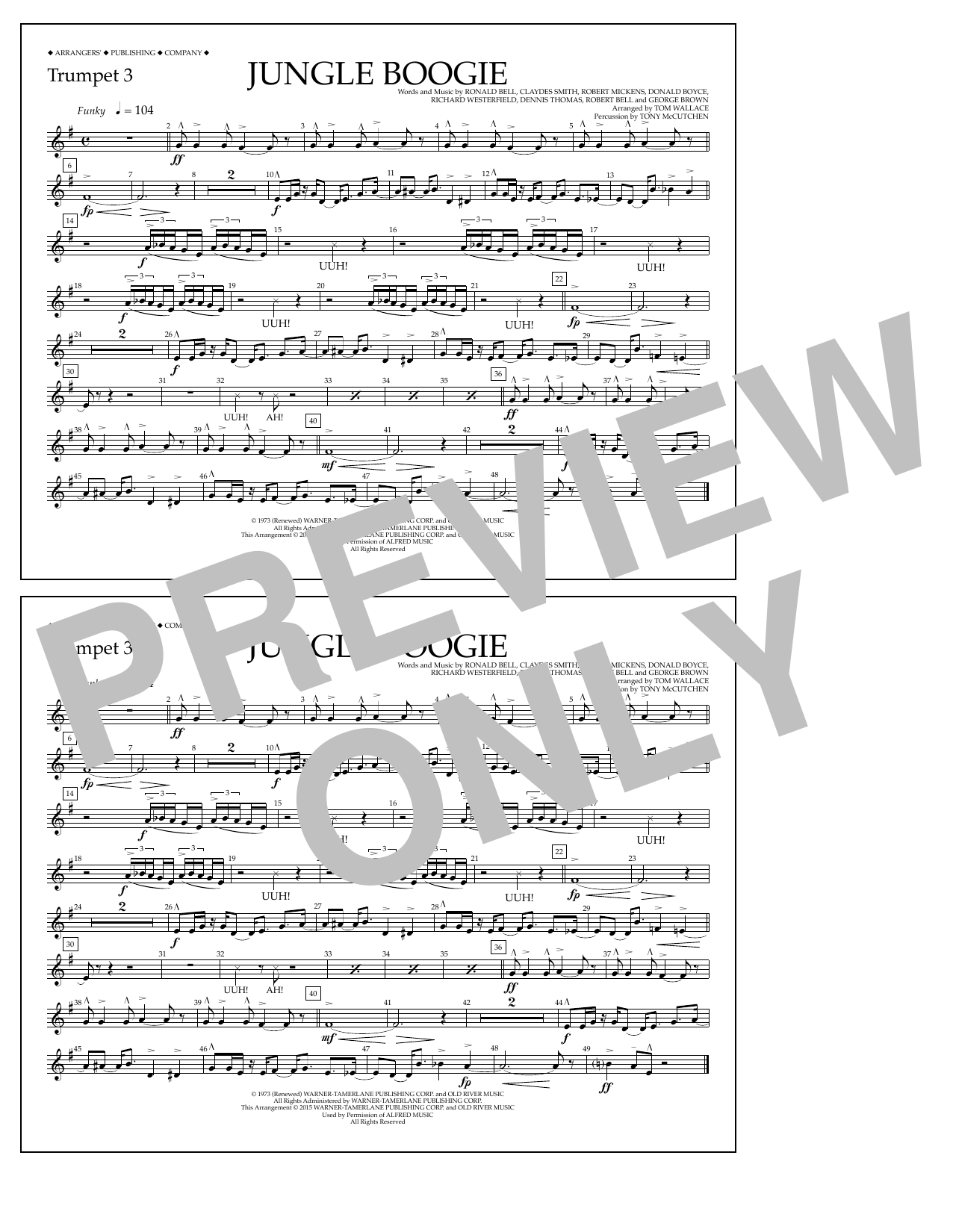 Download or print Tom Wallace Jungle Boogie - Trumpet 3 sheet music, chords and digital score arranged for Marching Band. This Pop score includes 1 page(s).