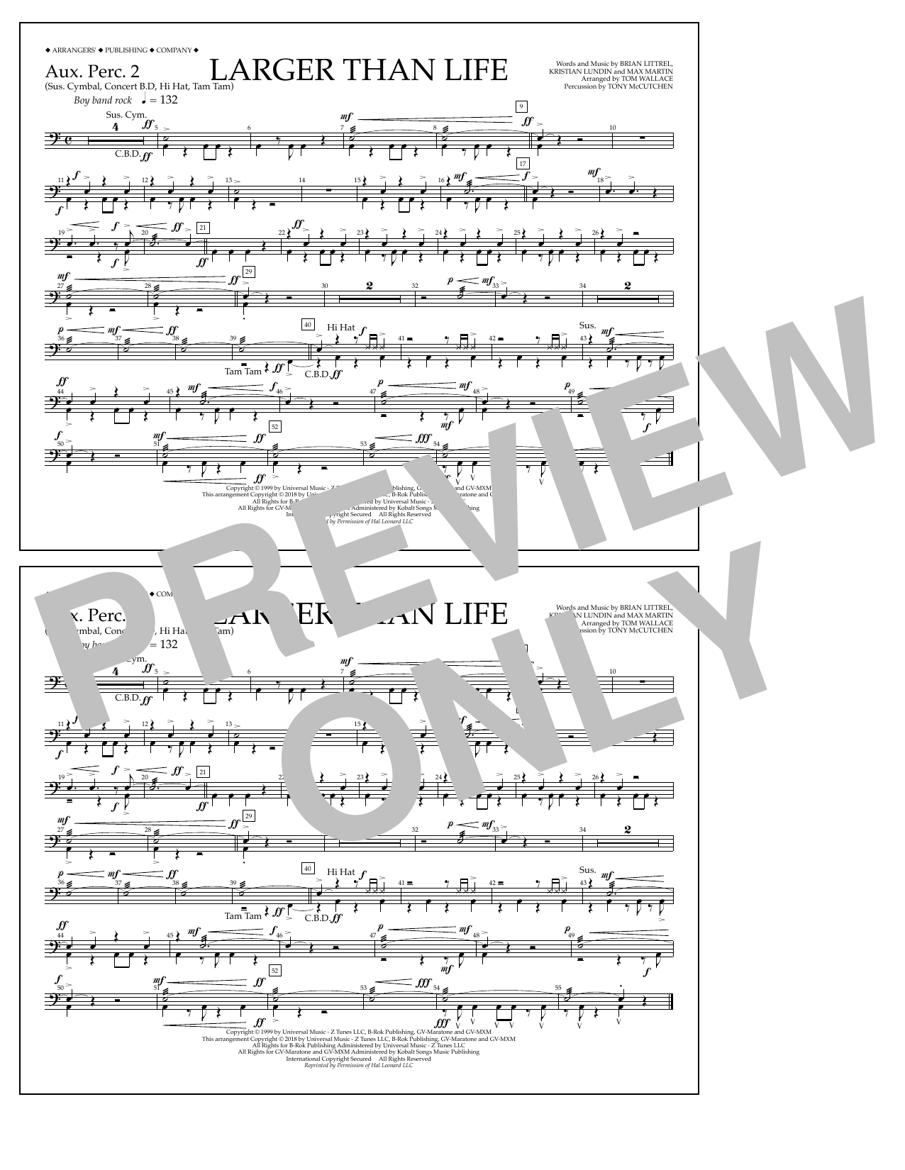 Download or print Tom Wallace Larger Than Life - Aux. Perc. 2 sheet music, chords and digital score arranged for Marching Band. This Pop score includes 1 page(s).