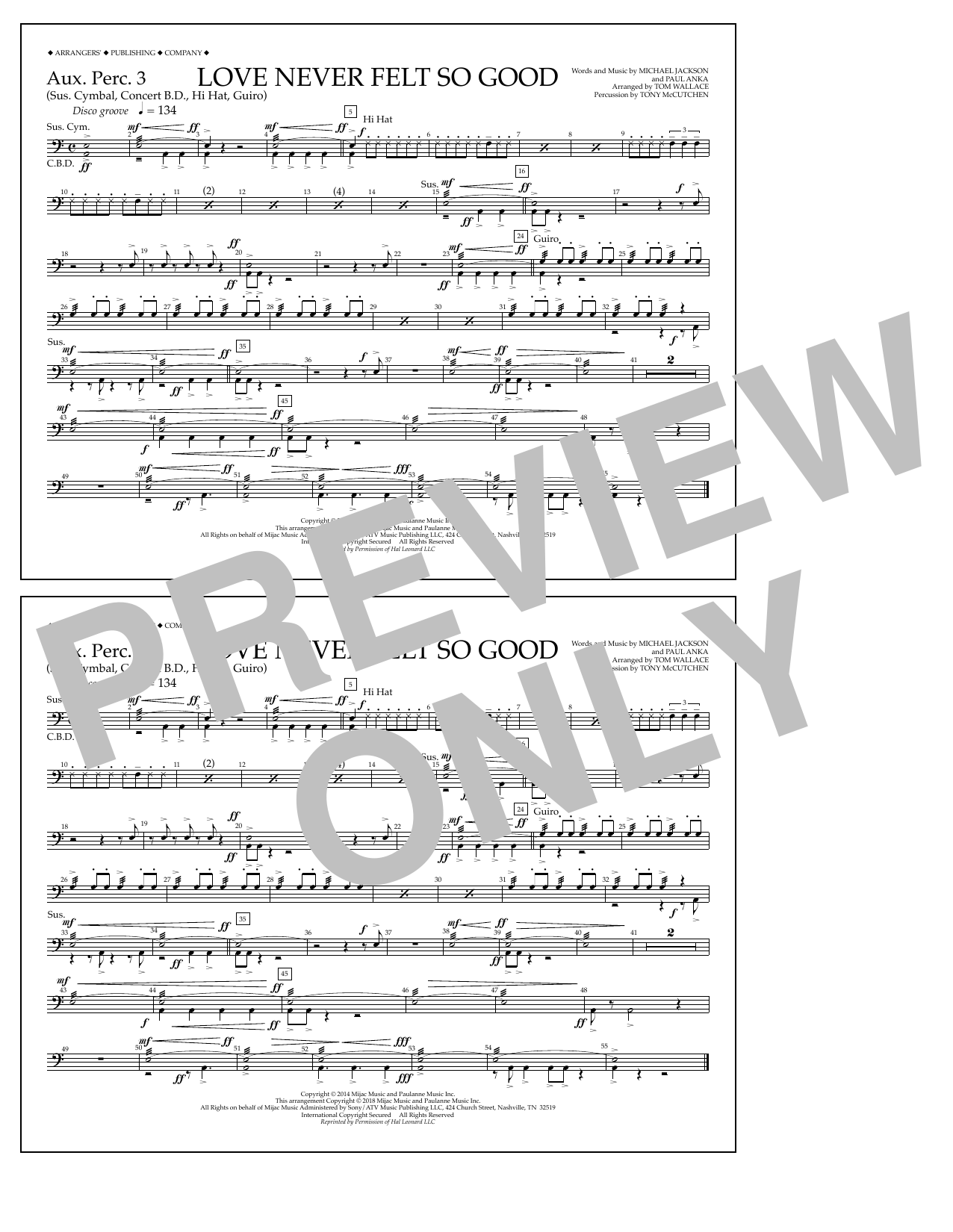 Download or print Tom Wallace Love Never Felt So Good - Aux. Perc. 3 sheet music, chords and digital score arranged for Marching Band. This Pop score includes 1 page(s).